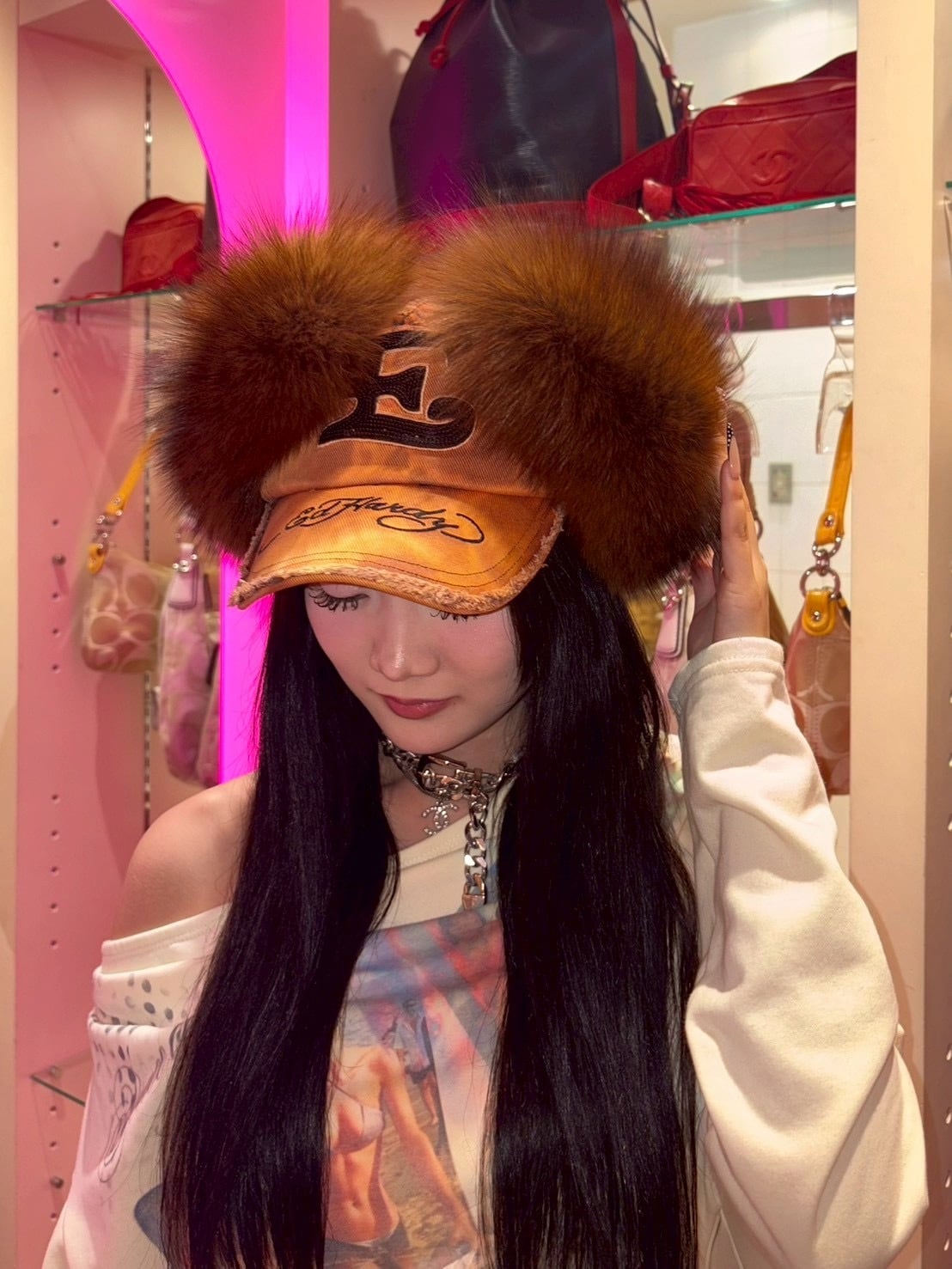 Remake Ed Hardy Real Fur Cap y2k